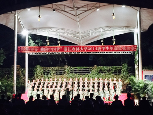 晚上7点,军训营举行了以“唱响青春,我的中国梦”为主题的歌咏比赛。校领导、各军训营教导员、指导员、教官和全体新生观看了歌咏比赛。我院33名学生与外国语学院学生代表十营参赛并获得三等奖。