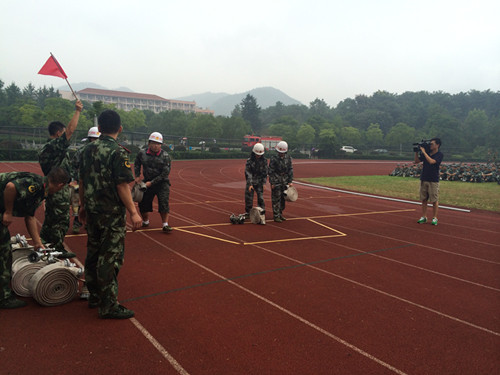 14日,新生军训第五天,集贤学子开始学习跑步立定、步伐变换等训练内容。下午,全校新生在塑胶田径场参与防空防灾安全教育,包括防诈骗安全教育、灭火演习、水带接力比赛、参观警用装备等。