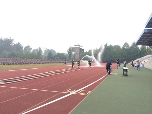 消防官兵穿戴装备跳下红色消防车,背着水带跳迅速跑到训练场地,向同学们现场演示救火行动,各方正爆发出热烈的掌声。