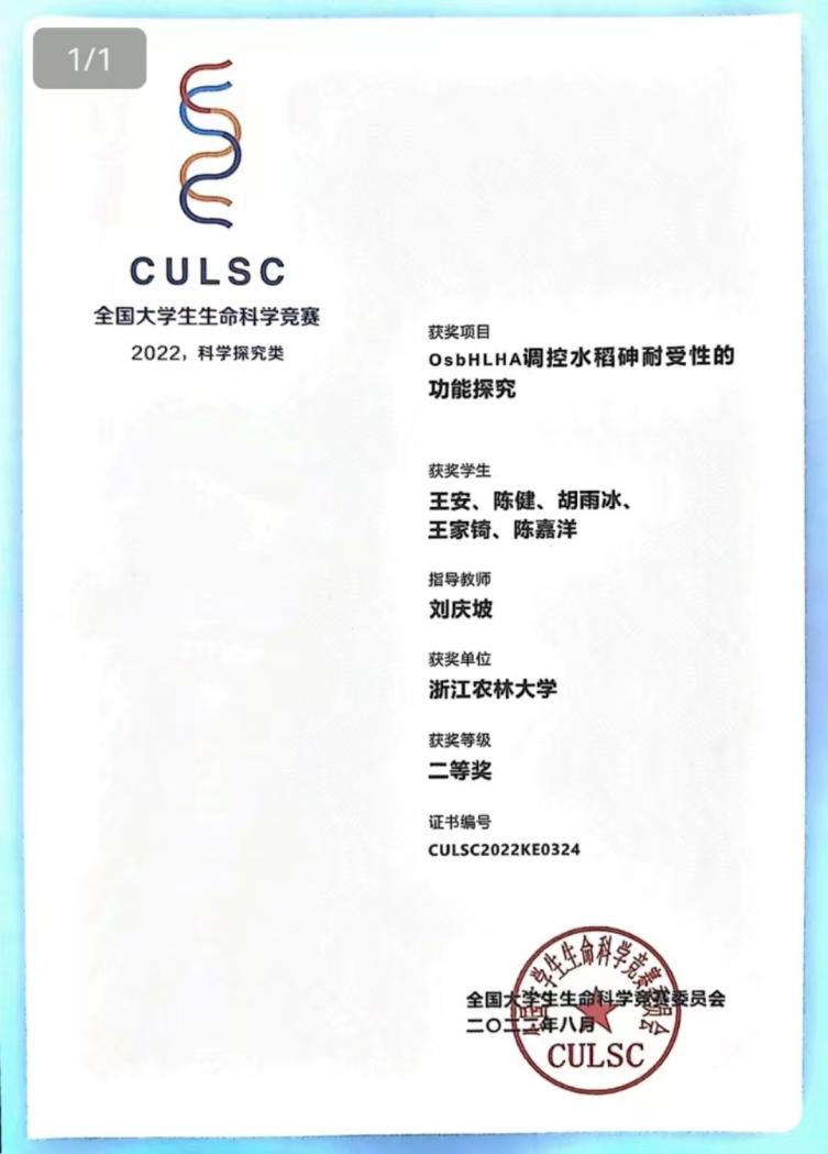 2022年浙江省第十四届大学生生命科学竞赛获一等奖、全国大学生生命科学竞赛二等奖