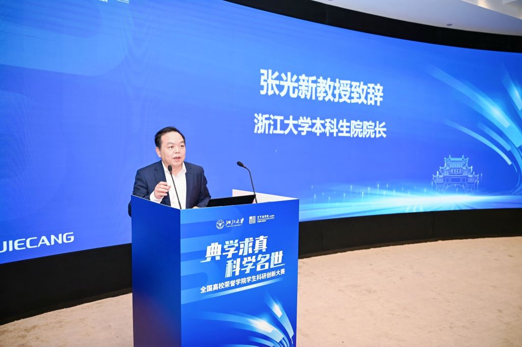 本次比赛由浙江大学竺可桢学院主办,浙江大学本科生院院长张光新在致辞中指出各高校荣誉学院在拔尖创新人才自主培养方面使命光荣、责任重大,充分肯定了竺可桢学院办学40年来的创新探索。期待同学们以此为契机,深度参与科研创新,提高自己提出问题、发现问题和解决问题的能力。