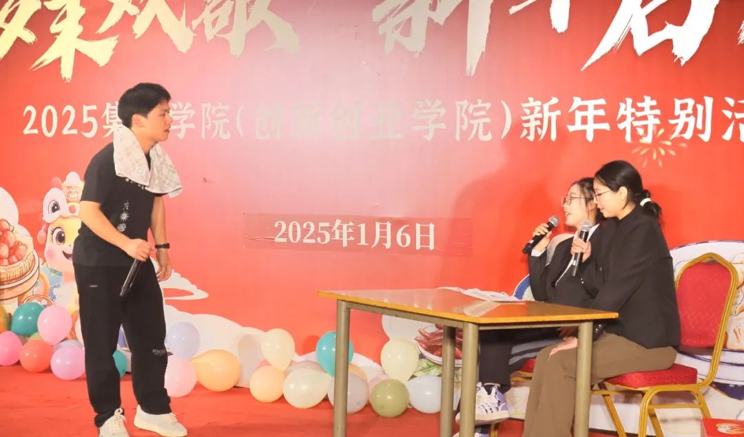 谢忆培、郭绚然、洪娟伟、王菁、蒋震寰、周杰等同学的小品《招聘会》以贴近现实的题材、幽默诙谐的表演,生动展现了当代大学生求职过程中的趣事与挑战,将求职过程中的机遇、困境、乌龙一一呈现,引得台下观众阵阵欢笑与共鸣。