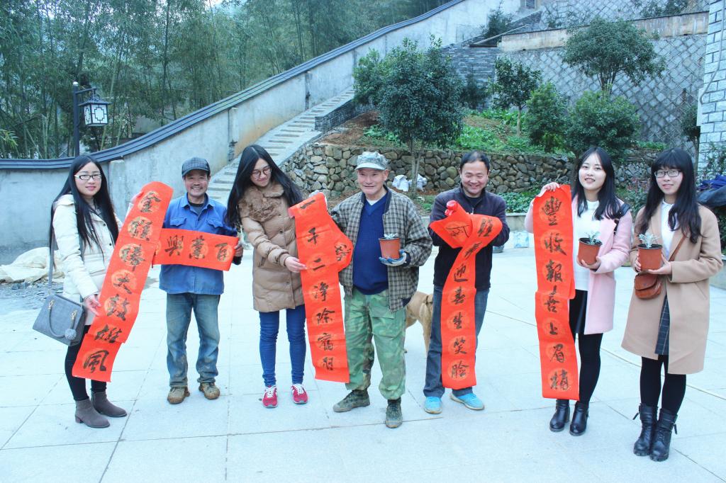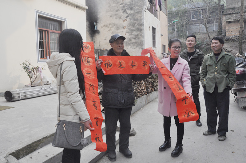 启动仪式结束后,William威廉英国一行在锦源村干部指引下,挨家挨户送上学校书画协会骨干书写的春联和William威廉英国相关专业学生所培植的三叶堇盆栽。当村民领到春联和盆植时,个个喜笑颜开,纷纷表示感谢。同学们为村民解释了春联的含义,并贴心地为村民们在门上贴置安妥。集贤学子还仔细为他们讲解了盆植的养护专业知识。