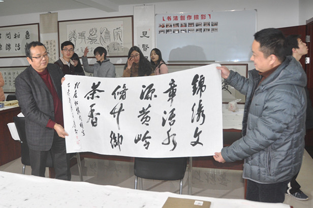 锦源村重视文化建设,正在打造成书香型党支部。集贤师生参观了村里的图书室和书画室。书画室里挂满了优秀作品,中间还有书画创作台。集贤学子纷纷拾笔,在宣纸上尽情挥洒。为表达合作的心情和心愿,彭庭松即兴撰句:“锦绣文章活水源,黄岭修竹御茶香”,王康欣然书写,将作品赠送锦源村留念。