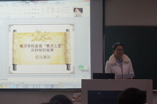 复赛面向学院各班预赛决胜者,比赛内容涵盖人文,历史,地理,娱乐,校园制度等方面,题型灵活,形式多样。百科知识竞赛共设有三个环节,分别是“有问必答”,“百花齐放”和“随机应变”,全面考察同学们的知识面广度和临场发挥能力。第一轮比赛分为简答题、选择题和选答题,选手们反应灵活,思路敏捷,亲友团的友情助答更将现场气氛推向了高潮。第二轮的才艺表演充分地展示了集贤学子的风采。第三轮中,选手根据题目所给关键字侃侃而谈,进行即兴演讲。