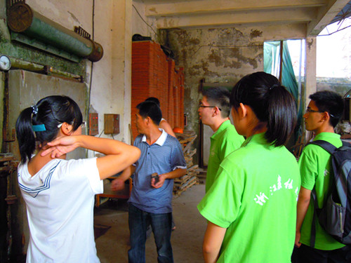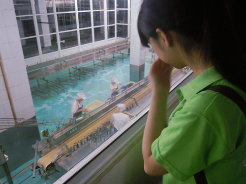 集团生产线负责人首先带领队员们参观了企业生产线,在红外线清洁室消毒后,队员们分别参观了三文鱼罐头流水加工车间和速冻加工鱼糜制品系列生产线,据负责人介绍,企业旗下的八大生产线一年可生产15000吨精细加工海产品。在带领参观并对生产流程加以介绍的同时,生产线负责人还耐心回答了队员们的提问,这次实地车间考察对队员们而言是一次全新的体验,许多队员表示,过去在超市购买过许多海产制品,但对其生产加工过程则一直没有太多的了解,通过负责人的介绍,感受到了生产线工人的辛苦,也观察了产品生产的具体流程,可说是获益匪浅。