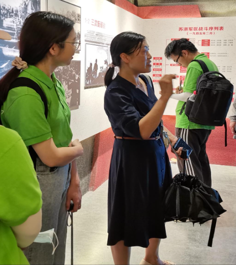 下午,实践团参观临安区高虹新四军纪念馆。在讲解员的细致讲解下,实践团成员认真聆听革命先烈粟裕、刘别山的英勇抗战事迹,细致考察图文、实物、影像等珍贵的历史资料,感受当地军民在抗战中英勇无畏的革命精神,对“烽火共战,军民齐心”的主题宗旨有了更深的感悟,也深刻认识到了乡村党史资料的珍贵价值。