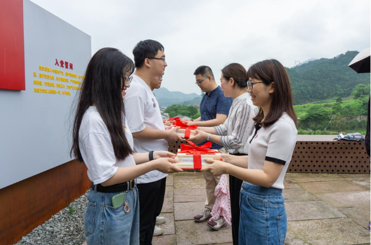师生党员前往宣誓广场,一同朗诵了陈望道先生所翻译的第一版《共产党宣言》。在入党宣誓墙前,党总支委员为新发展的学生预备党员代表送上《党章》、党徽、党费证、《党员学习记录本》等“六宝”,随后全体师生党员一起郑重宣誓,重温入党誓词。