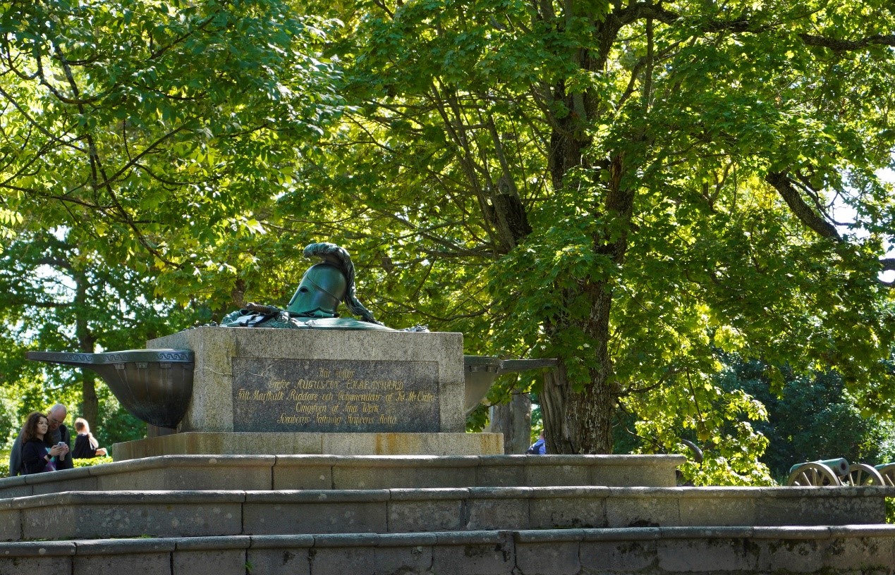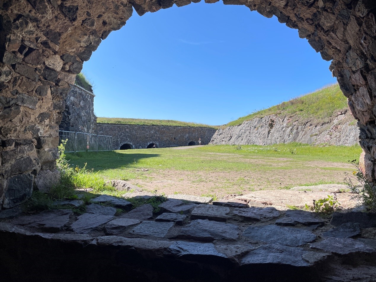 一是在一个几乎完全漆黑的地宫中探险——除了比较低矮完全没有任何危险。即便导游小哥在行前提醒了大家小心碰头,依旧有几位同学磕到了头;二是地标“SuuriLinnanpiha”——这是几百年前一位指挥官的纪念碑,我未曾见过此类墓碑,感到有些新奇;三是在准备返回码头的路上见到的岛上的一个小操场,让我回忆起我在中国江西省老家的乡村小学,由于十几年前经济较为落后,那里的操场也如同那个小操场一般,仅仅是在野草地中用沙石铺出一块较为平整的大片空地罢了。然而现如今已是先进的塑胶环形操场了,每每回想起来还是有些让人唏嘘不已!