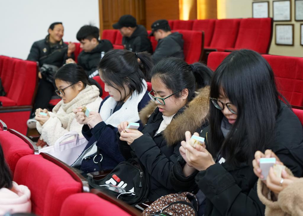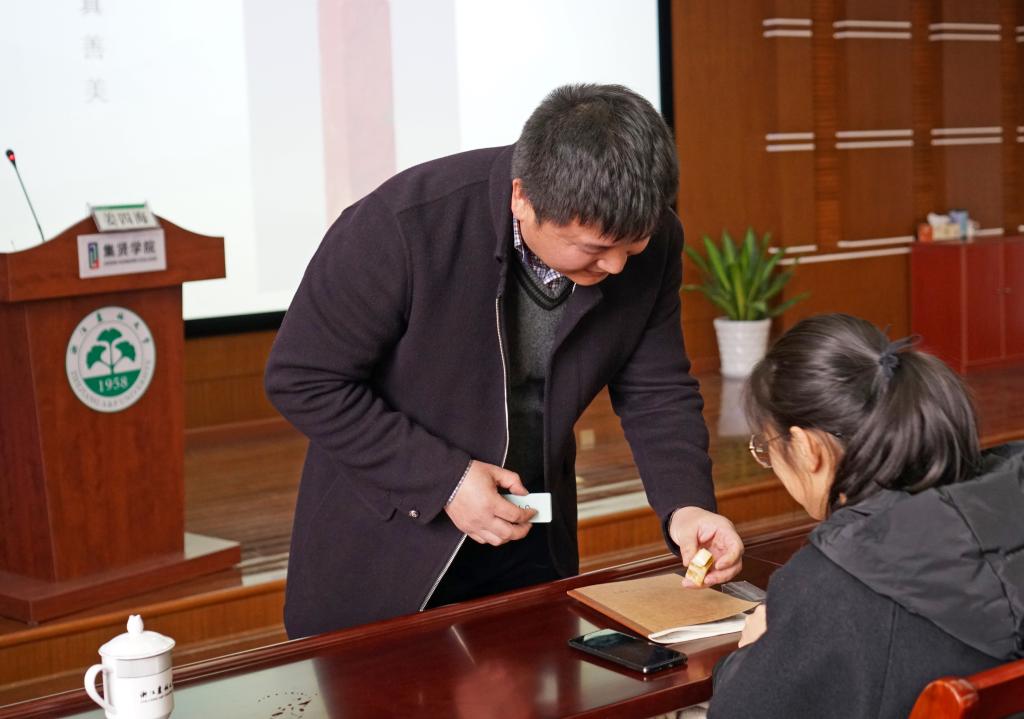讲座中,姜四海先生还赠送每位师生一枚印石,现场指导学生进行玉石打磨,大家在打磨实践中细细品味、加深感悟。姜四海先生将人生比作制印,引导广大青年学生要追求本真、诚信做人,做真实的自我,并鼓励大家知行合一,为传播传统文化贡献一份力量。