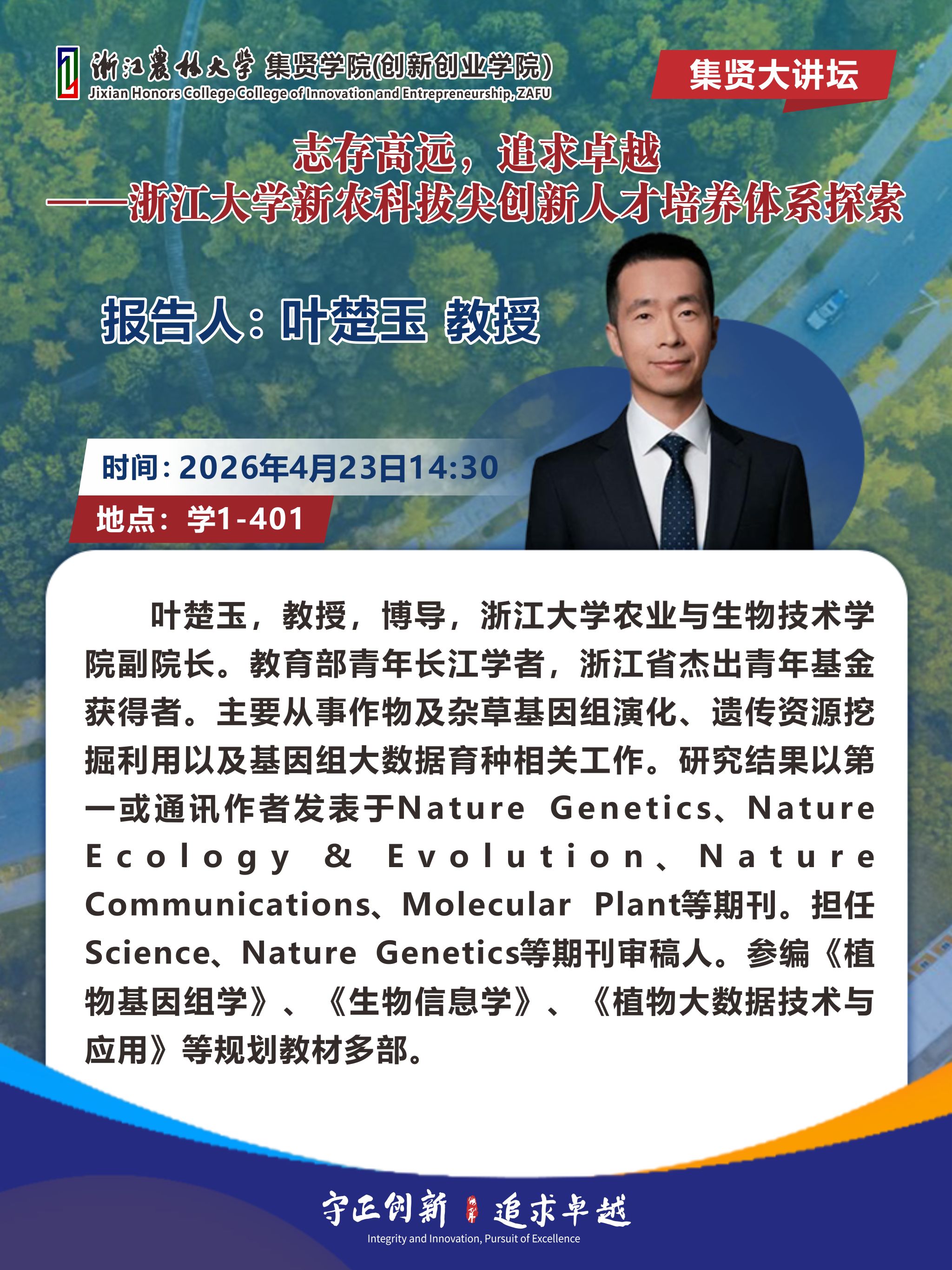 “集贤大讲坛”预告——叶楚玉教授:志存高远,追求卓越——浙江大学新农科拔尖创新人才培养体系探索